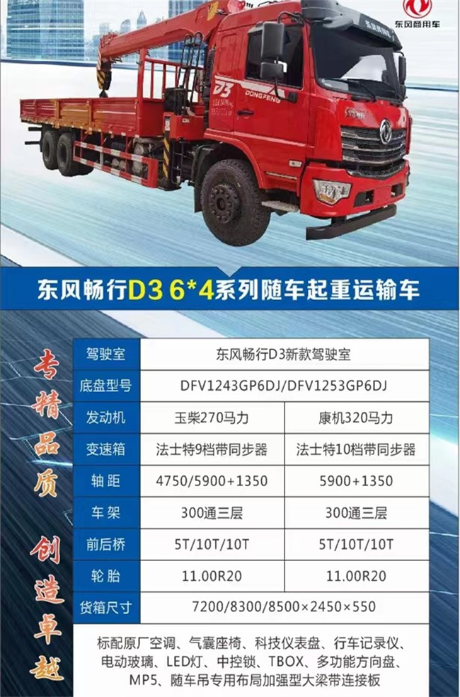 12噸短軸距暢行D3后八輪隨車吊7.2米/8.3米貨廂后雙橋短軸距隨車吊可選,先說說為什么選后雙橋短軸距隨車吊,整車短(10米左右)好拐彎,主要用于工地及農(nóng)村路,后雙橋短軸距隨車吊保住了25噸總質(zhì)量及自重輕些,也可選320馬力與270馬力玉柴可選,路況不好時,下雨天路不好駛時,大馬力的優(yōu)點。